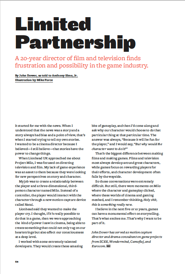 John wrote this article in Continue magazine about his experiences working on "Milo & Kate" with Lionhead/Microsoft.
